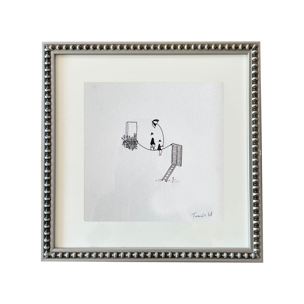 Cuadro de 33x33 cms. Reproducción técnica a lápiz del artista Tomás Id (eltomai). Enmarcado con fondo blanco y marco perlita plateado.