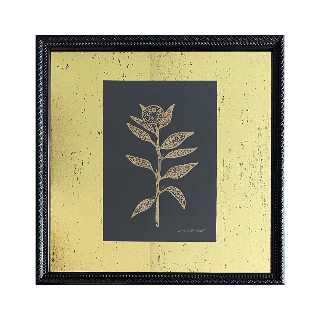 Linografía. Cuadro de 33x33cms. Enmarcado con fondo oro raspado hecho a mano en marco negro con greca
