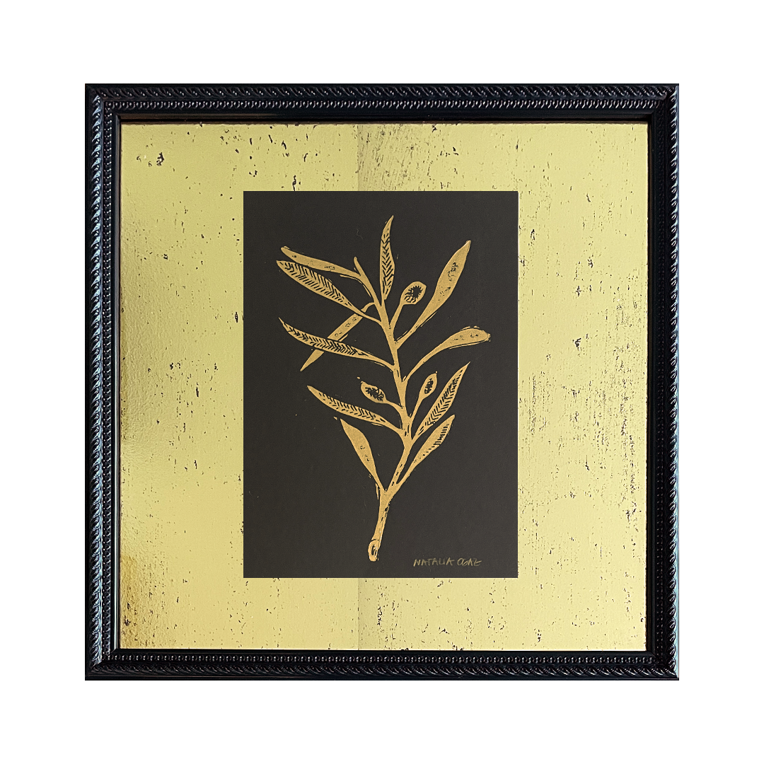 Linografía. Cuadro de 33x33cms. Enmarcado con fondo oro raspado hecho a mano en marco negro con greca