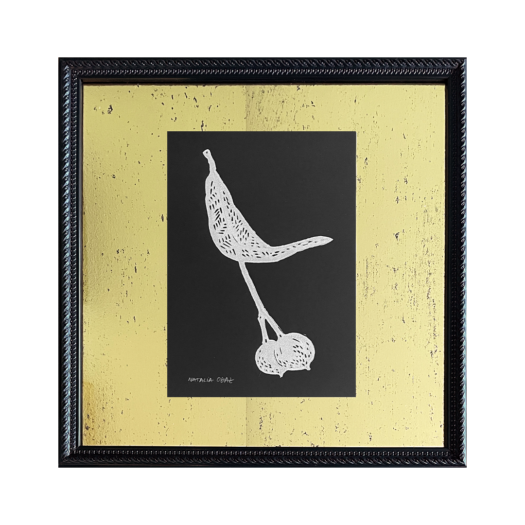 Linografía. Cuadro de 33x33cms. Enmarcado con fondo oro raspado hecho a mano en marco negro con greca