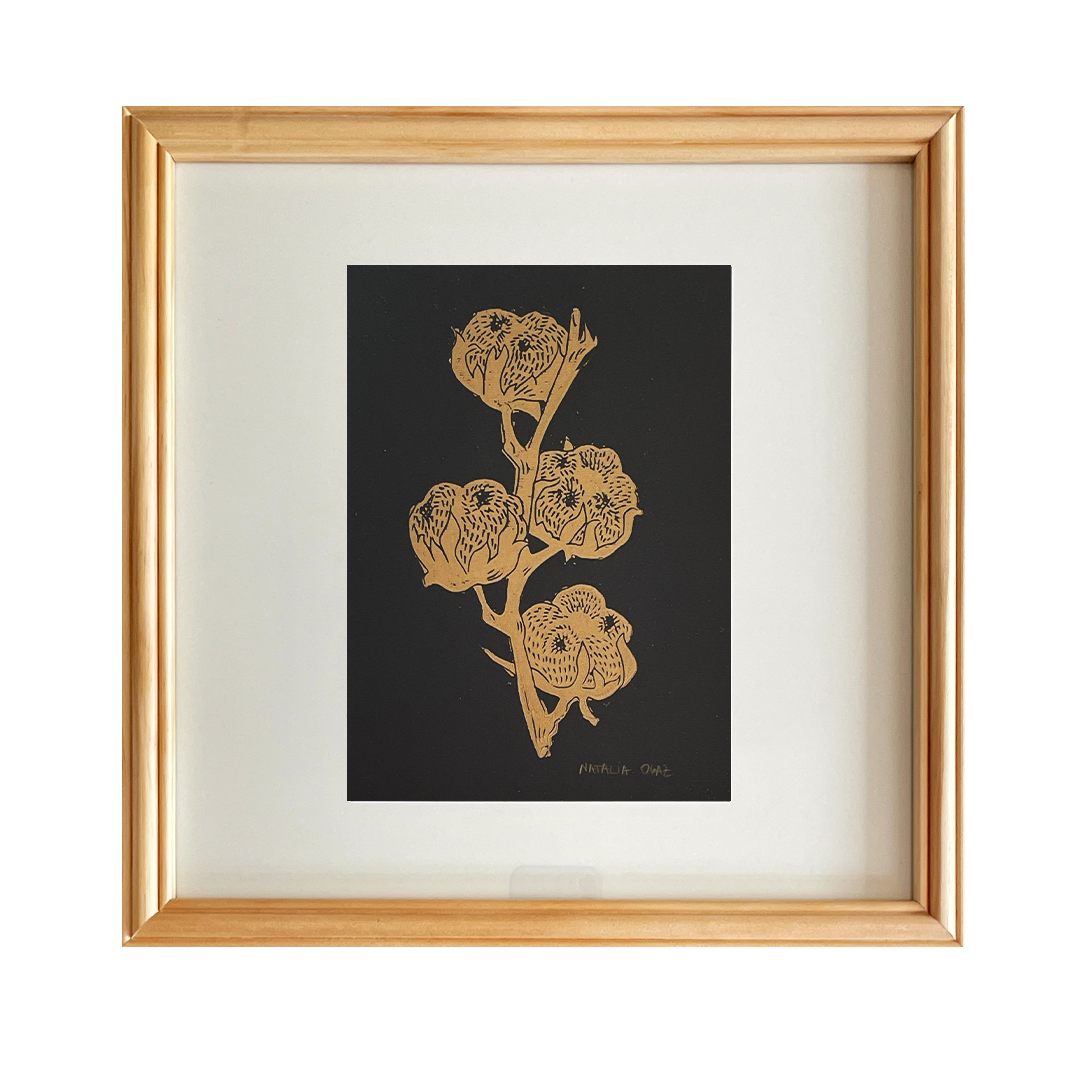 Linografía. Cuadro de 33x33cms. Enmarcado con fondo blanco en marco madera de madera color natural