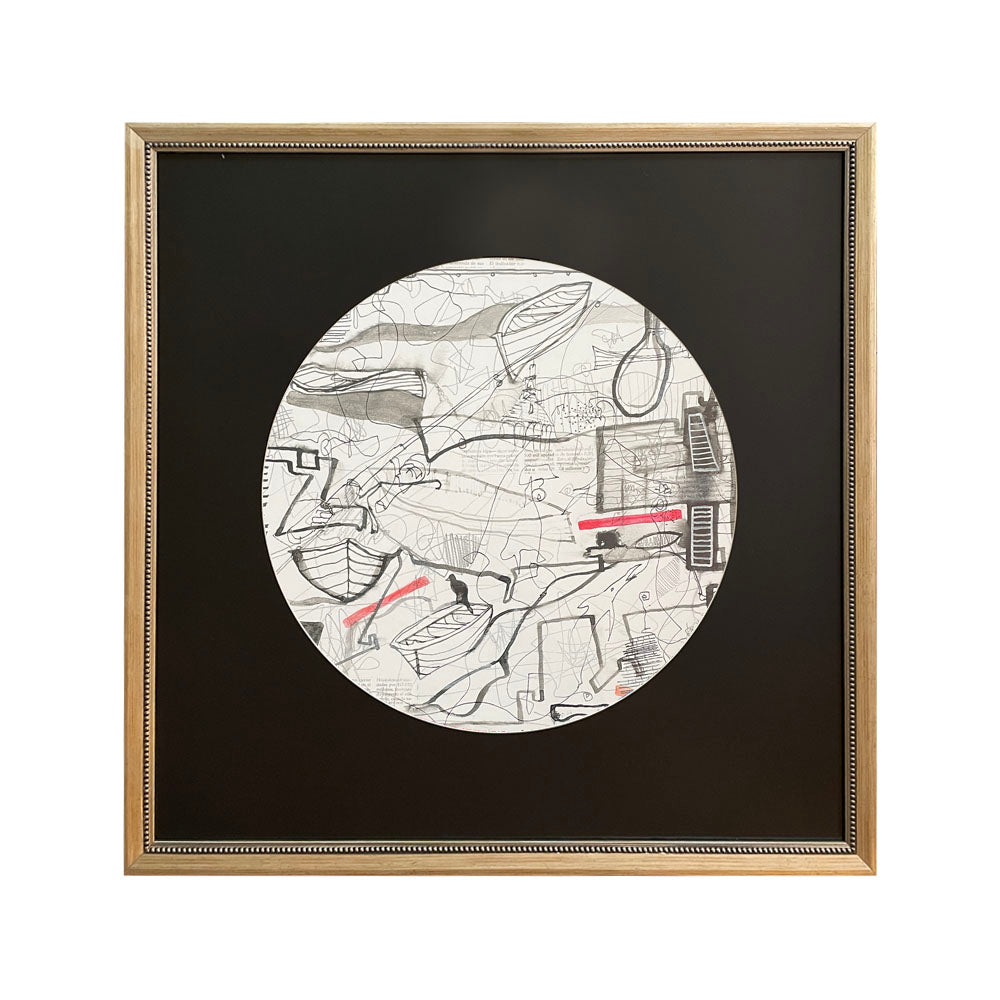 Cuadro de 62x62 cms. Reproducción técnica mixta de Patricio Zañartu. Enmarcado con paspartú circular negro y moldura folia plata con pelotitas.