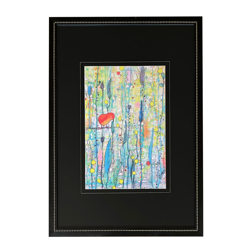 Cuadro de 77x54 cms. Reproducción de acuarela de la artista Sylvie Demers. Enmarcado con paspartú negro con bisel blanco y marco negro de madera con pelotitas plata.