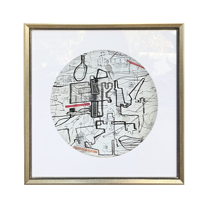 Ilustración de Patricio Zañartu. Enmarcado con paspartú blanco circular y marco champaña, detalles pelotitas 5 cms de frente y 2 de profundidad Dimensiones: 65 x 65 cms.