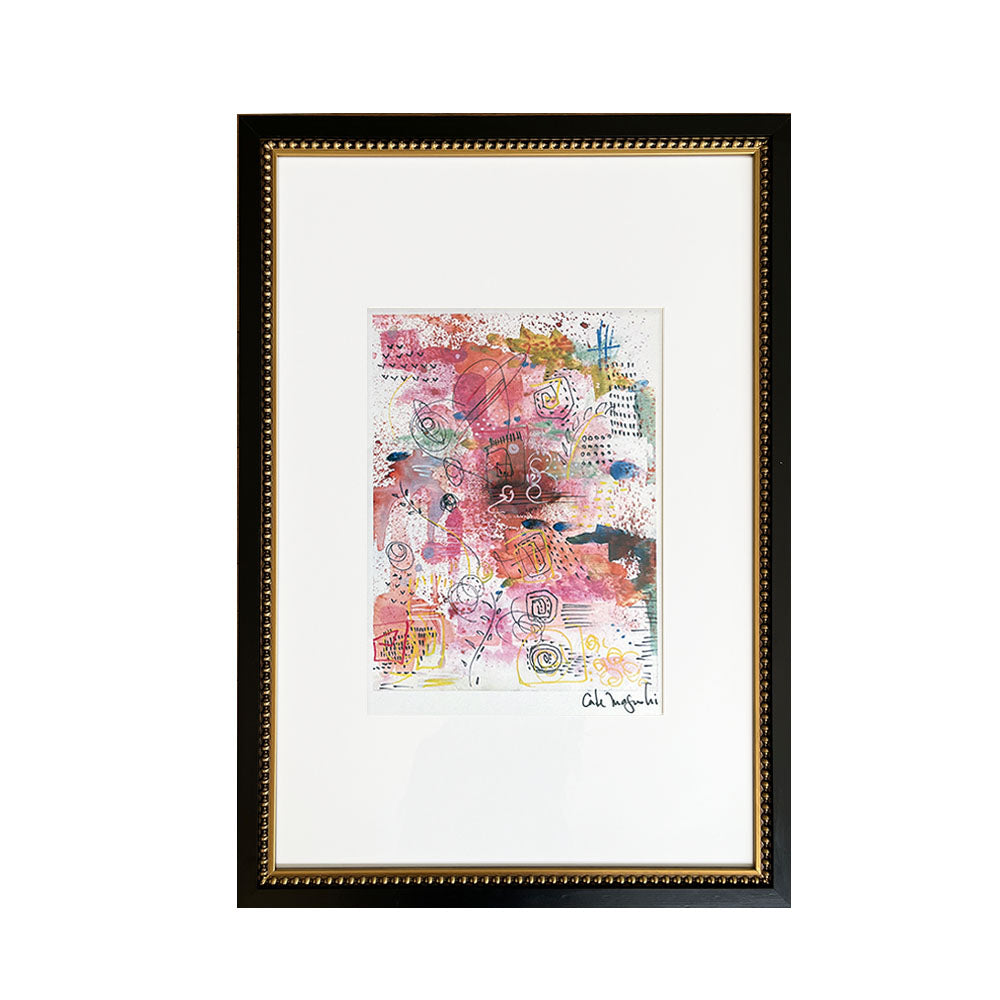 Ilustración de Caterina Magnolfi enmarcado con paspartú blanco en doble marco negro y pelotitas oro. Dimensiones: 54x77cms.