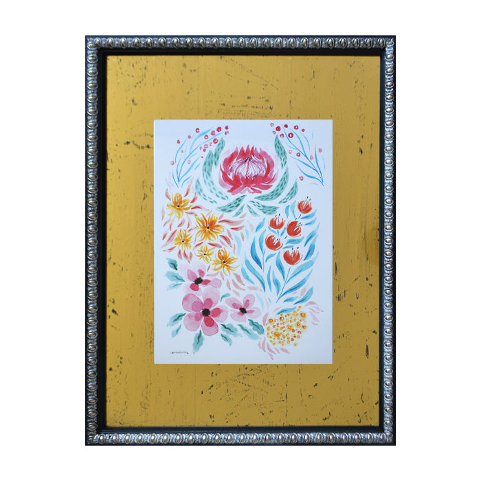 Ilustración de acuarela por Carmen Aguirre. Enmarcada en fondo oro raspado y marco Labrado Plata de 3 cms. Dimensiones: 52x67 cms.