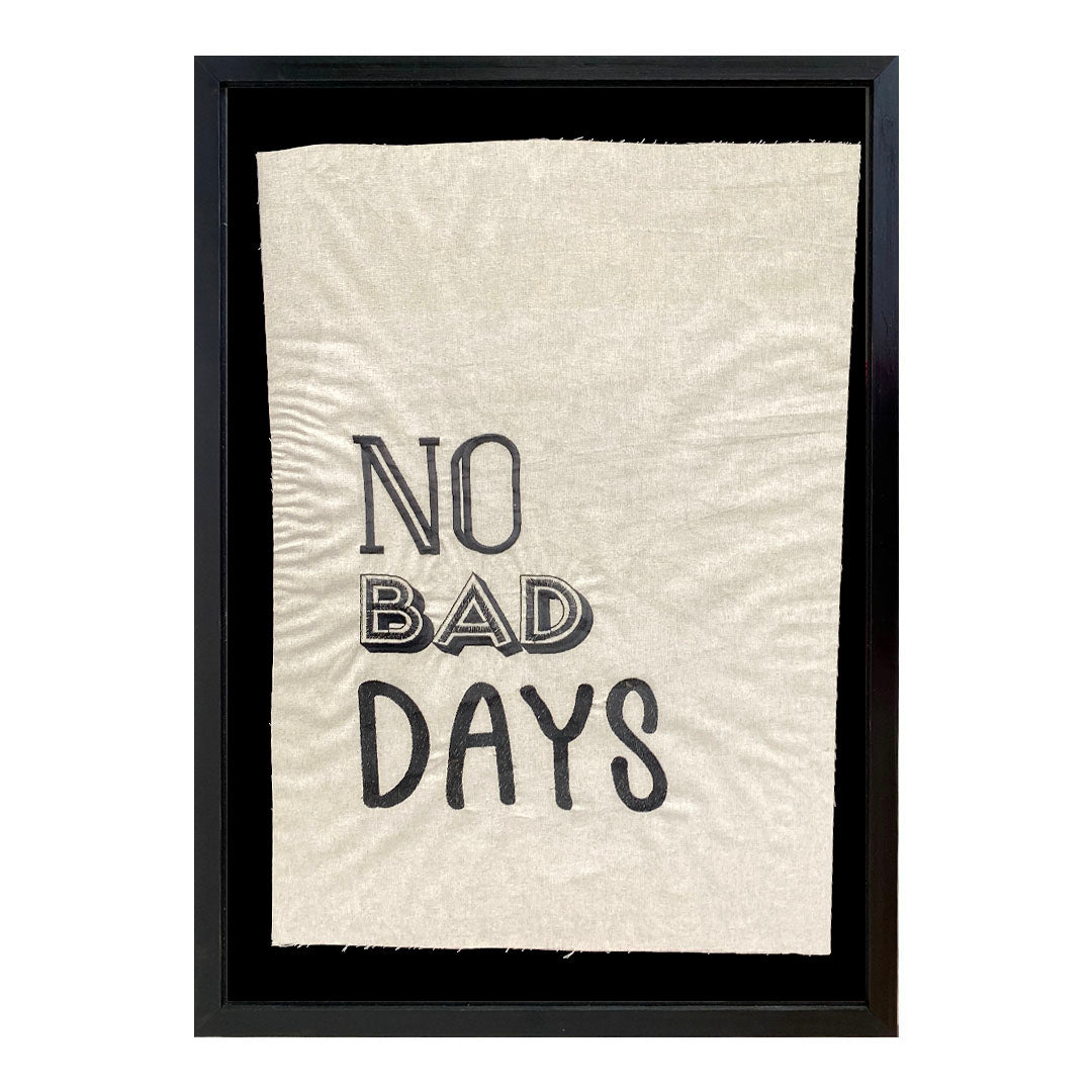Frase bordada en género blanco sobre fondo negro enmarcado en marco negro liso. Mide 70x50 cms.