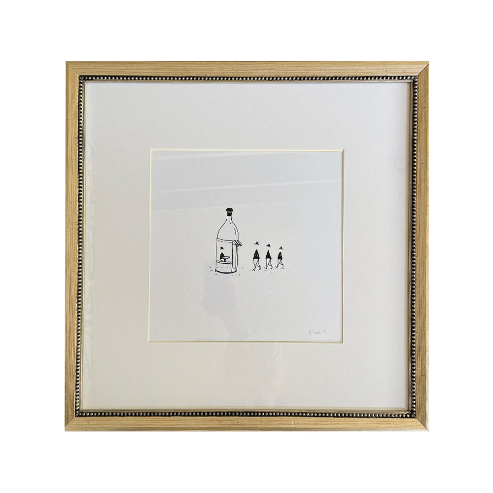 Ilustración por El Tomai con paspartú blanco. Enmarcada en marco champaña con detalle perlita delicada de 3 cms de frente.