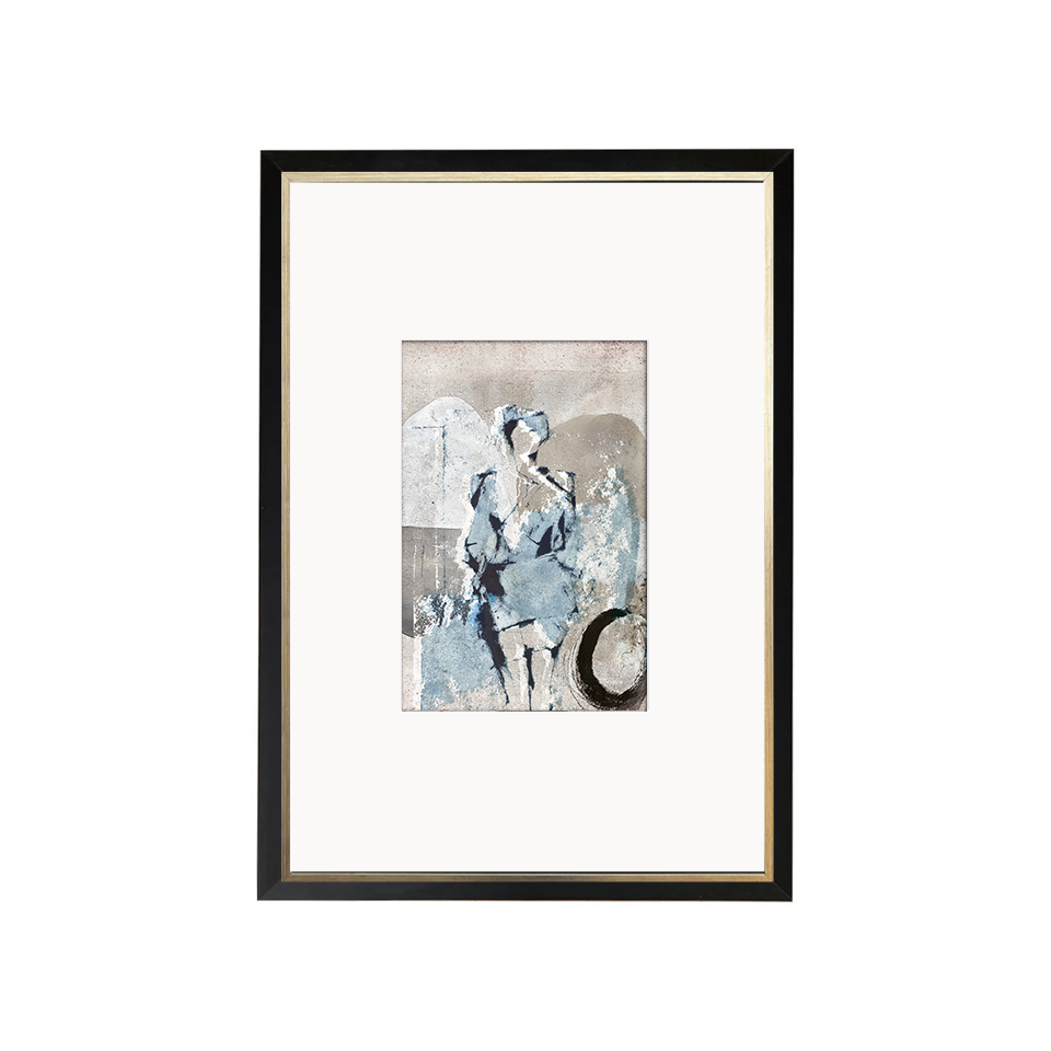 Cuadro de 77x54 cms. Ilustración digital realizada por Rosario Greene. Enmarcado con paspartú negro en doble marco. Marco negro liso por fuera y marco con perlitas plateado por dentro. Ambas molduras de madera de 2 cms de frente.