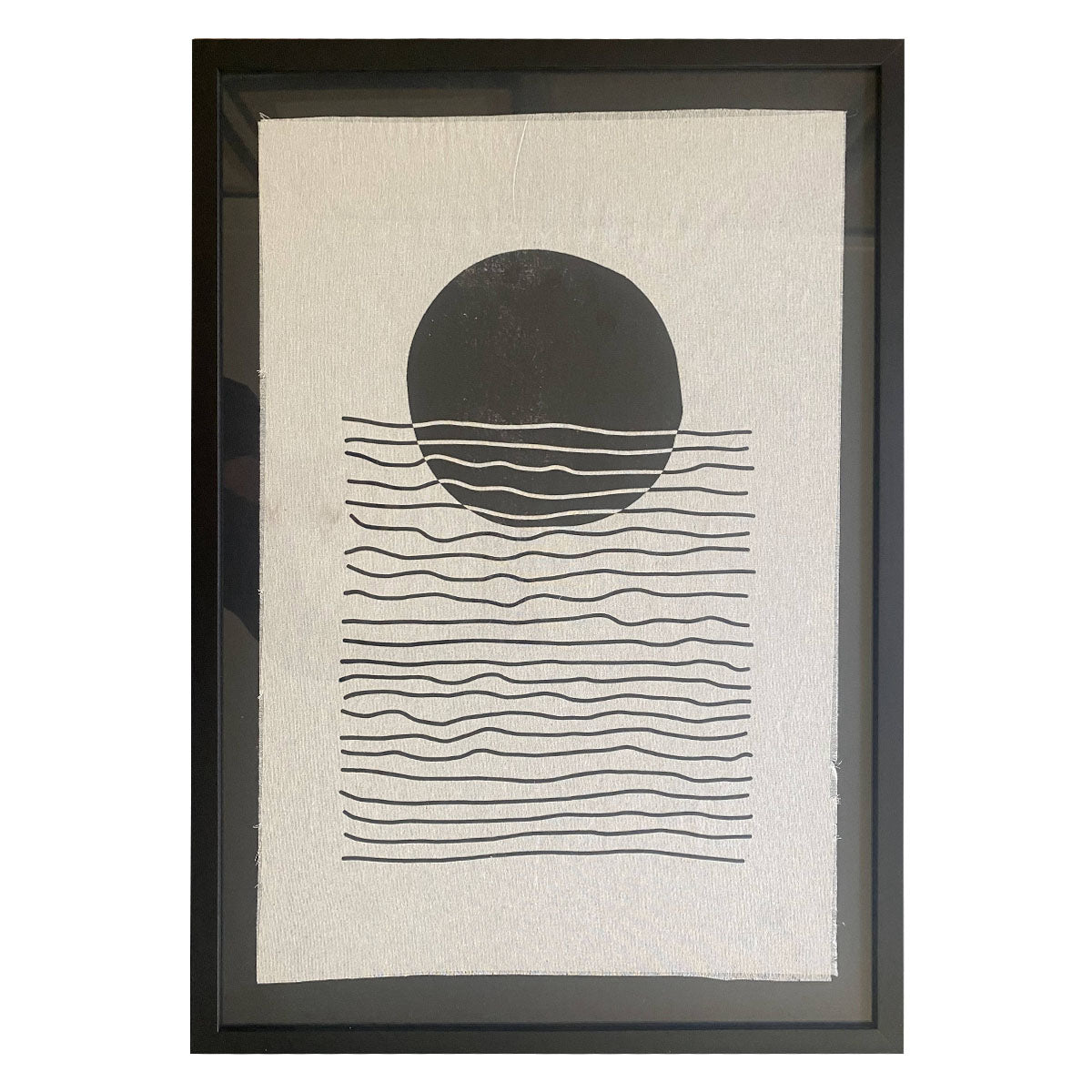 Serigrafía sobre tela con fondo negro en marco negro de 2cm de ancho y 2cm de profundidad. Dimensiones: 50x70cm.