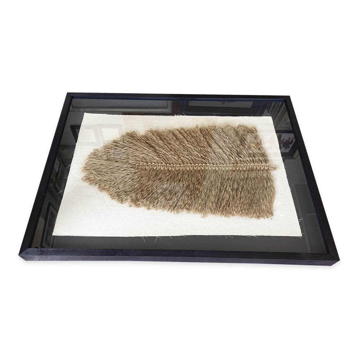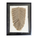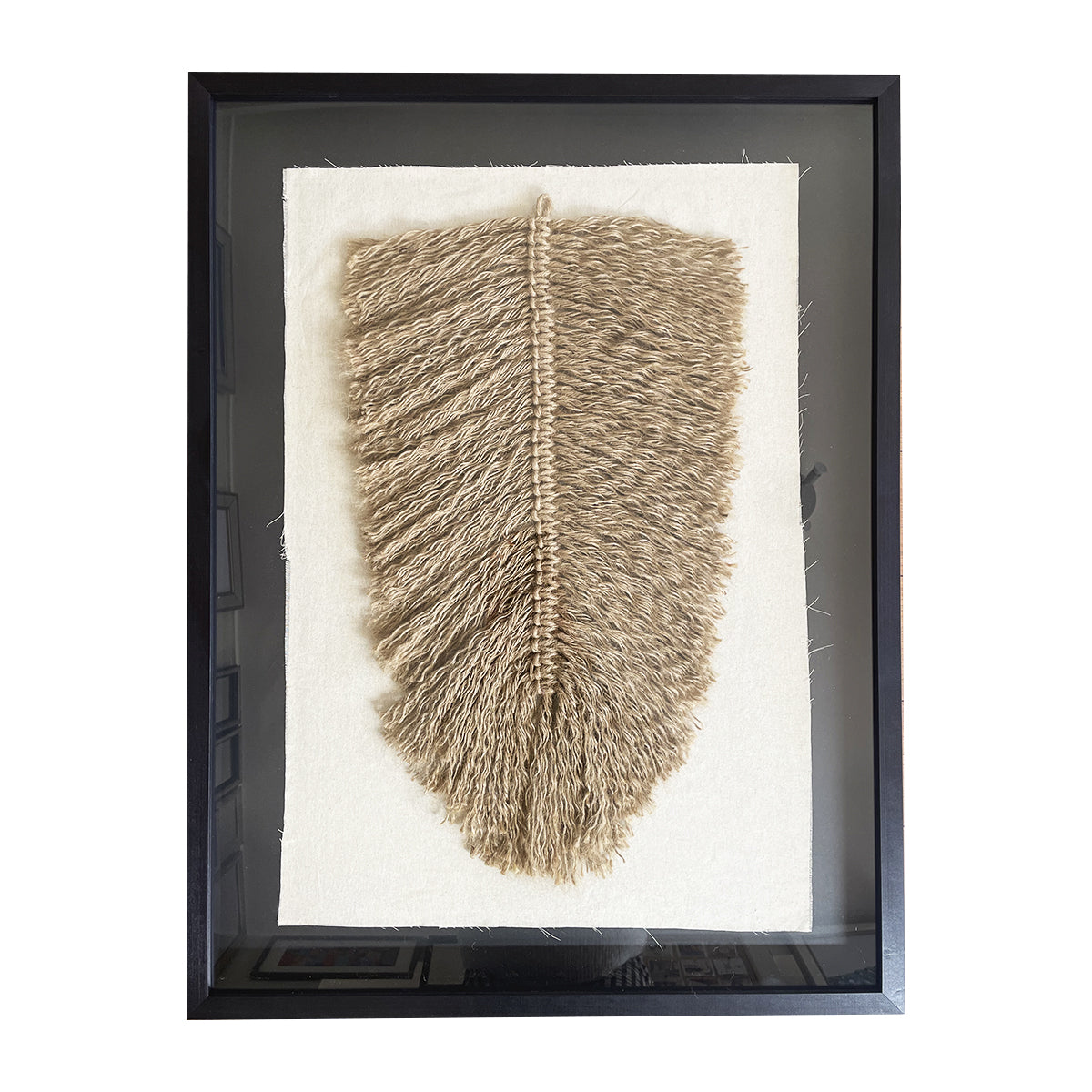 Macramé de Daniela Silva, hecho con fibras 100% yute natural. Enmarcado en un marco caja negra de 2 cm de frente y 4,5 cm de profundidad. El macramé está montado sobre un lino color crudo natural y luego un fondo negro, lo que genera una profundidad en el cuadro, que le otorga un efecto de elevación.