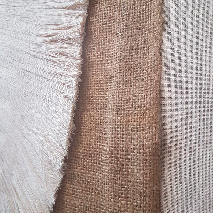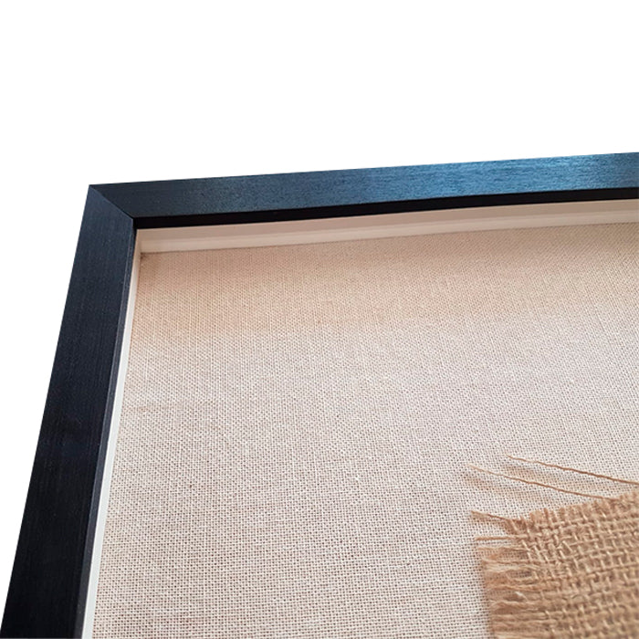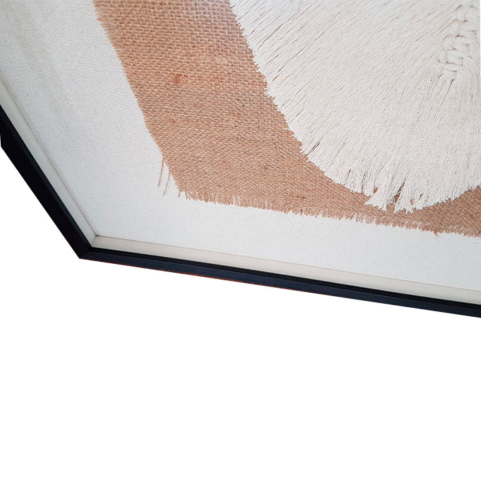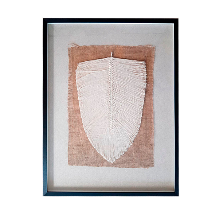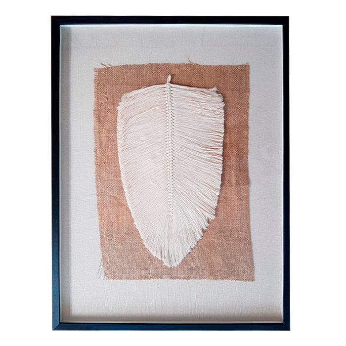Macramé de Daniela Silva, hecho con fibras 100% algodón peinado. Enmarcado en un marco caja negro de 2 cm de frente y 4,5 cm de profundidad. El macramé está montado sobre una arpillera y luego sobre un lino color crudo natural, lo que genera una profundidad en el cuadro, que le otorga un efecto de elevación.