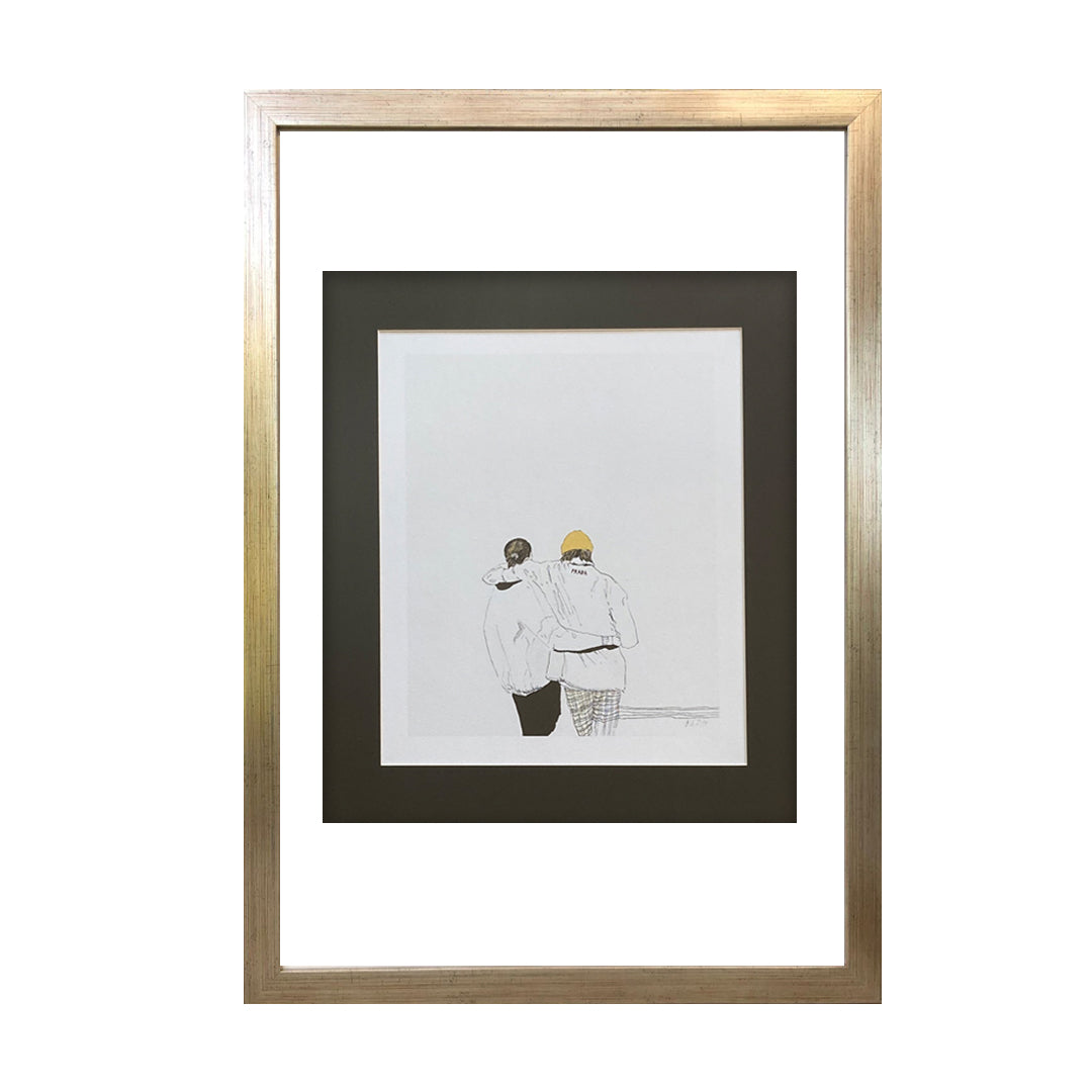 Ilustración de Rosa López. Enmarcado con doble paspartú blanco y 4 cm de negro. En marco C plata de 3 cms de frente. Dimensiones: 54x77 cms.