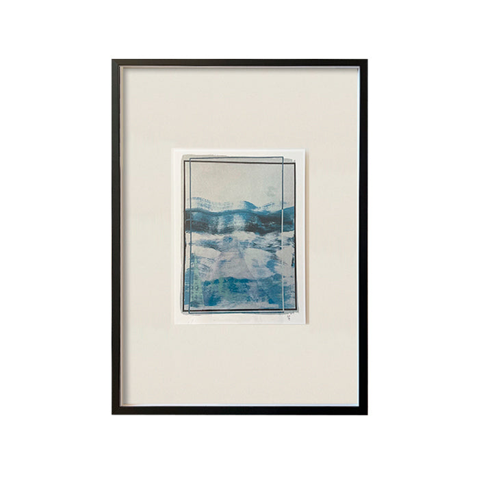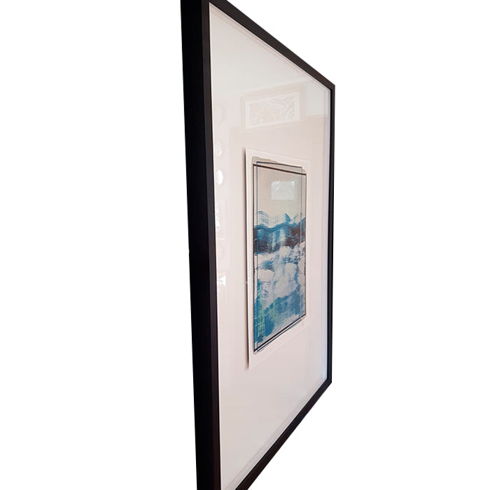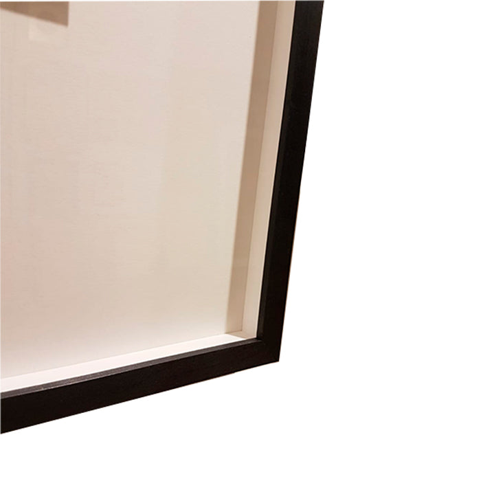 Ilustración de Rosa López. Enmarcado con fondo blanco en un marco caja negro de 2 cm de frente y 4,5 cm de profundidad. La ilustración está montada sobre un foam, lo que genera una profundidad en el cuadro, que le otorga un efecto de elevación.