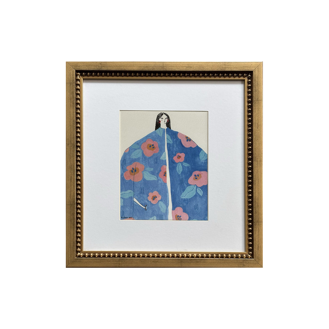 Ilustración de Elena Hohlberg. Impresión en papel con paspartú blanco. Enmarcado con doble moldura: Marco oro liso y marco oro con perlas, de 3,5 cms de frente en total. Dimensiones: 44x41 cms.