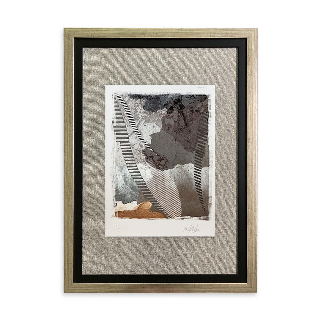 Grabado por María Jesús Ariztía. Enmarcado con fondo de genero rústico beige y doble marco C Plata y C Negro de 6 cms. Dimensiones: 63x88 cms.