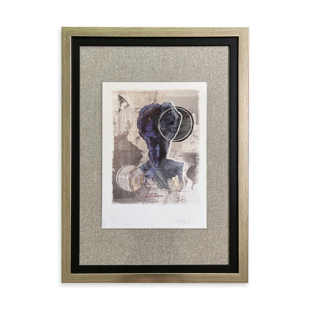 Grabado por María Jesús Ariztía. Enmarcado con fondo de genero rústico beige y doble marco C Plata y C Negro de 6 cms. Dimensiones: 63x88 cms.
