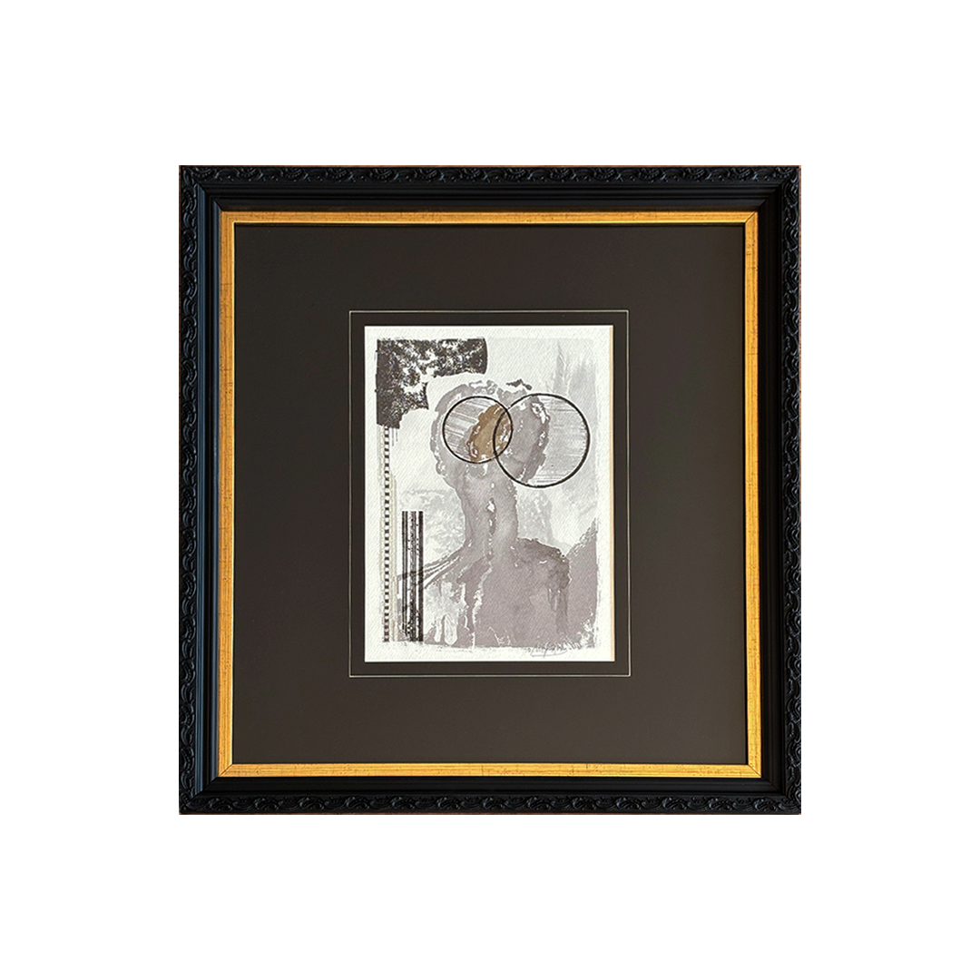 Grabado por María Jesús Ariztía. Enmarcado con paspartú negro con doble marco, negro greca por fuera y liso oro de 2 cms por dentro. Dimensiones: 60x65 cms.