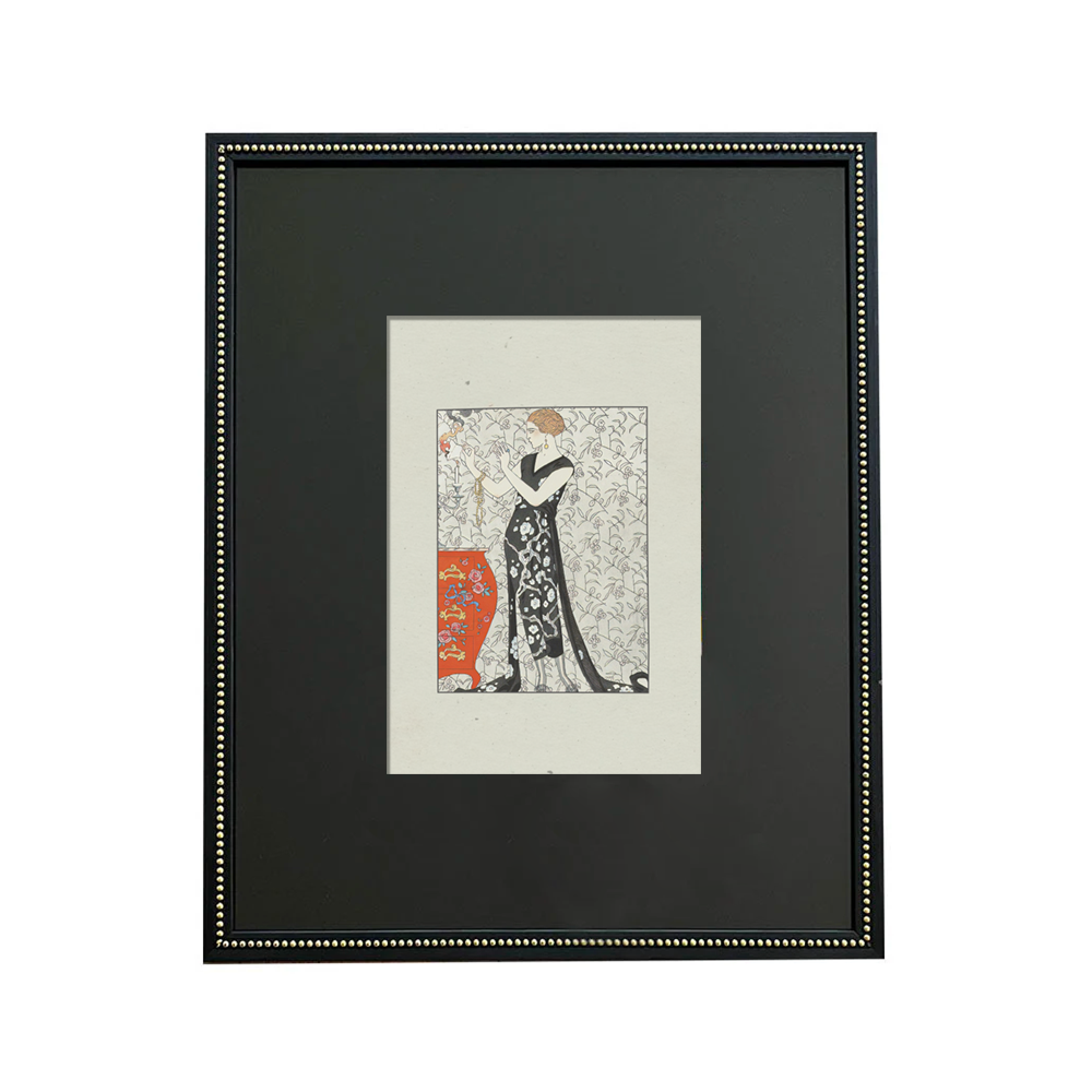 Cuadro de 43x53. Enmarcado con paspartú blanco y marco de madera negro con perlitas doradas de 2 cms. de frente. Con Vidrio.