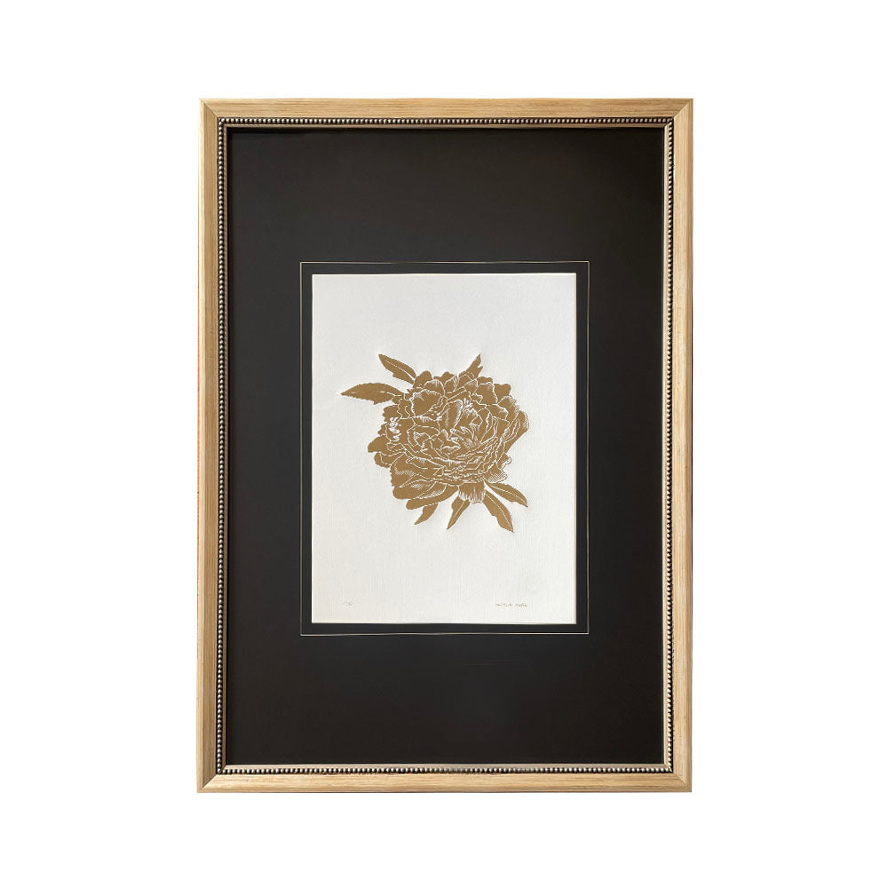 Linografía. Cuadro de 77x54cms. Enmarcado con paspartú negro con bisel y marco folia champaña con pelotitas