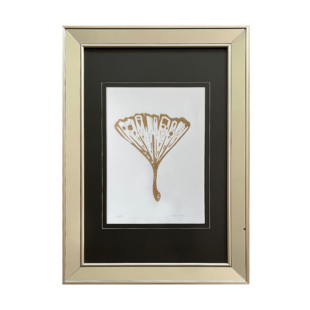 Linografía. Cuadro de 77x54cms. Enmarcado con paspartú negro con bisel y marco de espejo champaña de 6 cms.