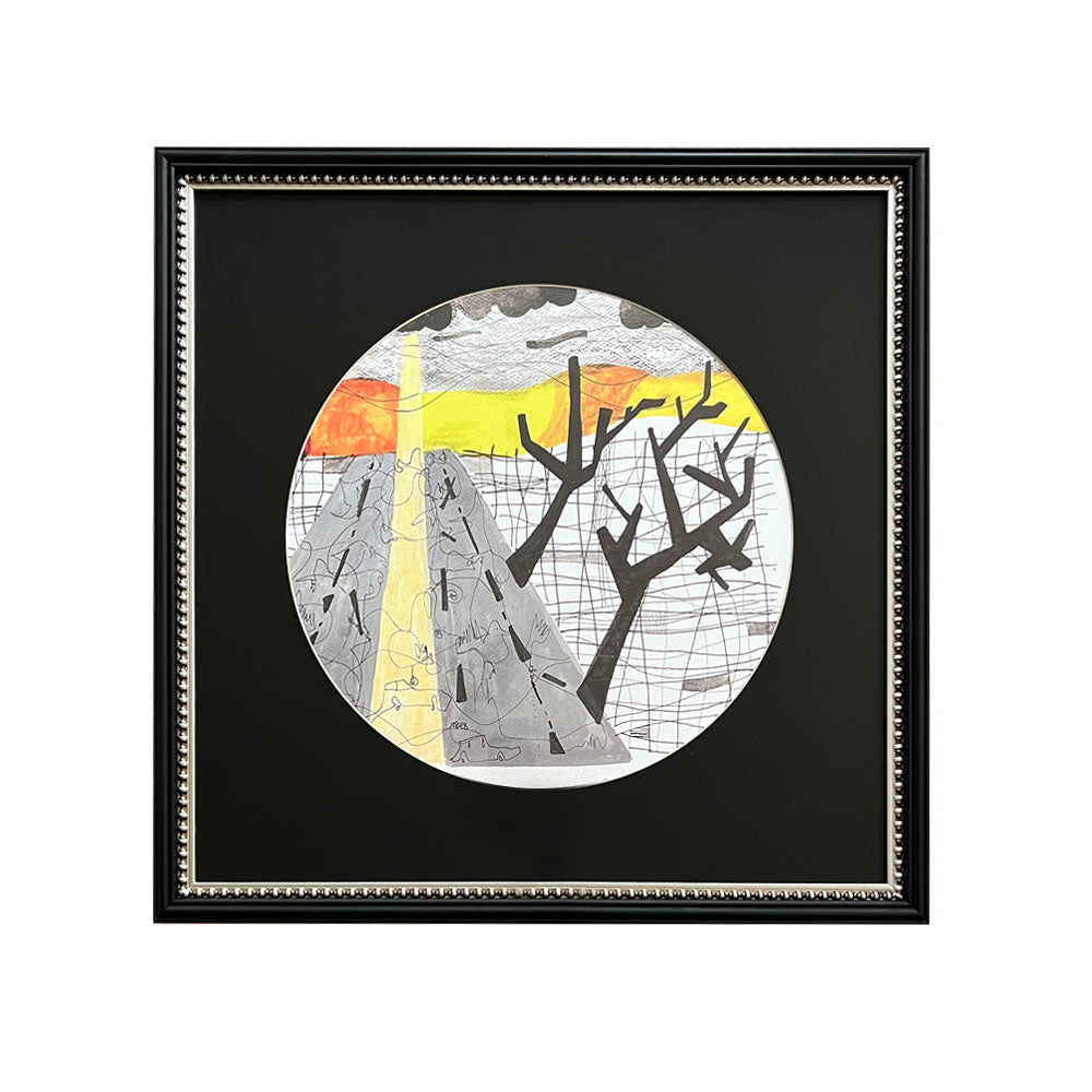 Cuadro de 67x67 cms. Reproducción técnica mixta de Patricio Zañartu. Enmarcado con paspartú circular negro y doble moldura.