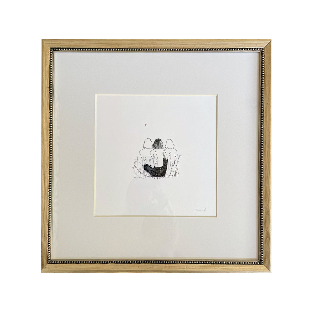 Ilustración por El Tomai con paspartú blanco. Enmarcada en marco champaña con detalle perlita delicada de 3 cms de frente.