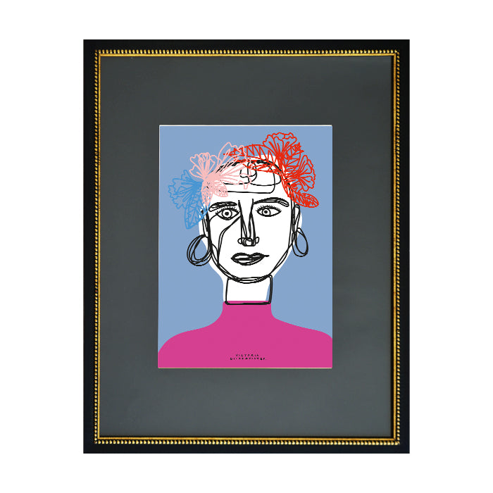 Ilustración de Victoria Gildemaister. Enmarcado con paspartú negro y marco 26 Greca Negro Oro. Dimensiones: 37,5 x 47,5cms.