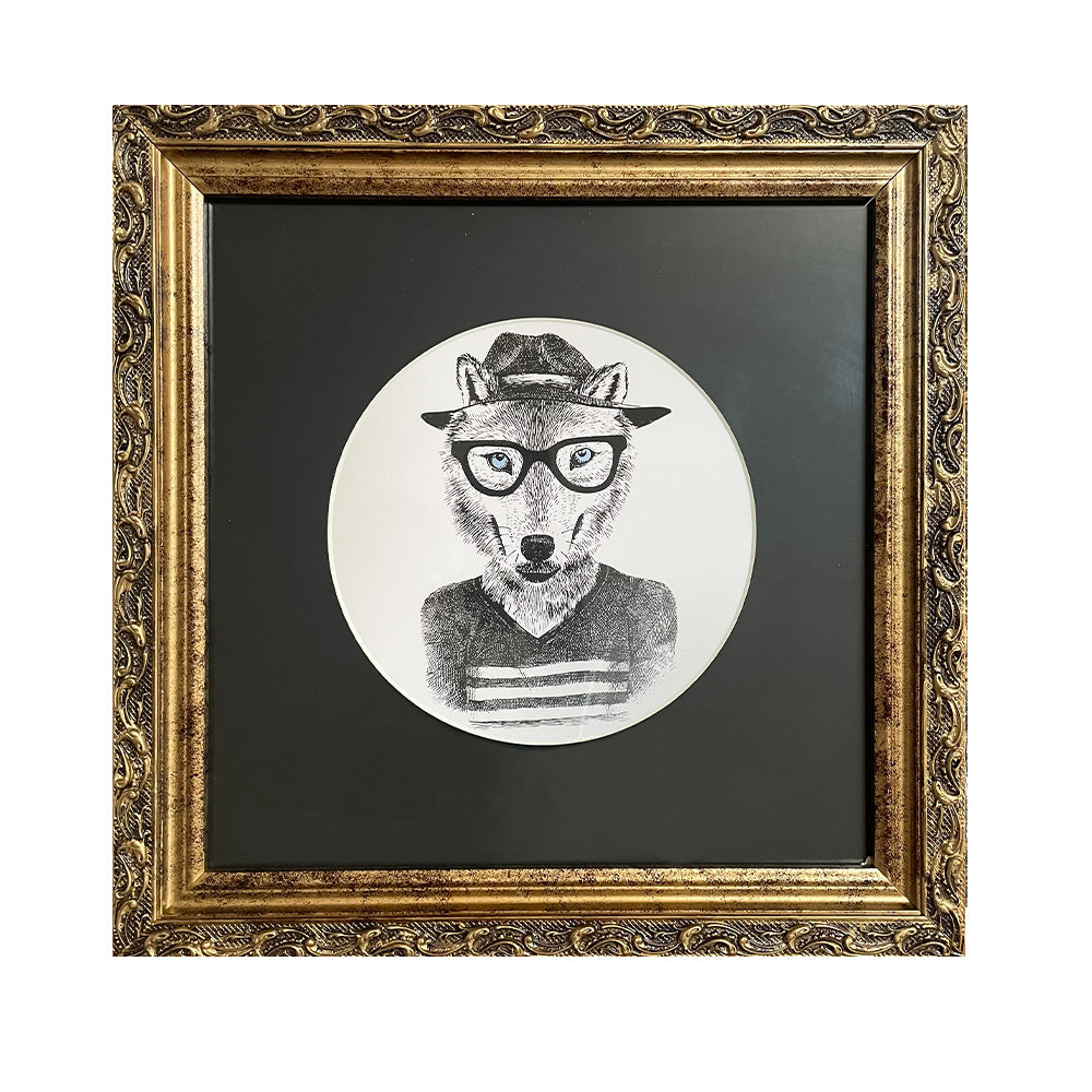 Cuadro de 36x36 cms. Lámina impresa. Enmarcado con paspartú circular negro, en marco rococo oro de 4 cms de frente.