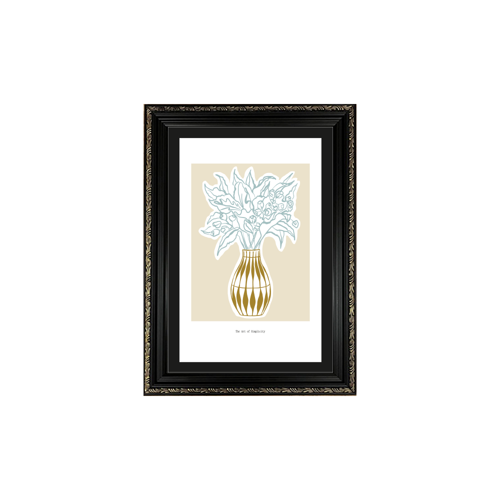 Cuadro de 36x51 cms. Ilustración digital realizada por Rosario Greene. Enmarcado directo en marco greca negro con espigas doradas de madera de 3,5 cms de frente .