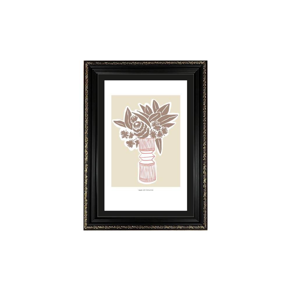 Cuadro de 36x51 cms. Ilustración digital realizada por Rosario Greene. Enmarcado directo en marco greca negro con espigas doradas de madera de 3,5 cms de frente .