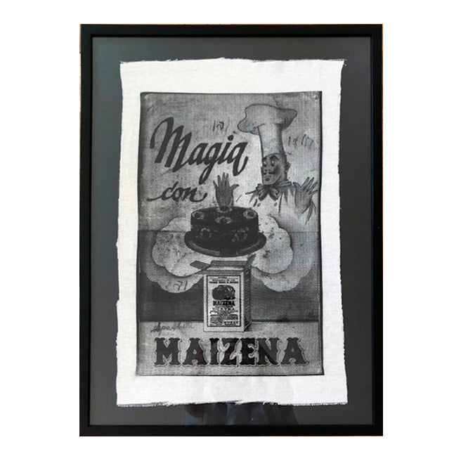 Serigrafía sobre arpillera, Fondo negro, enmarcado con marco A negro de 2 cms de frente y 2 cms de profundidad.