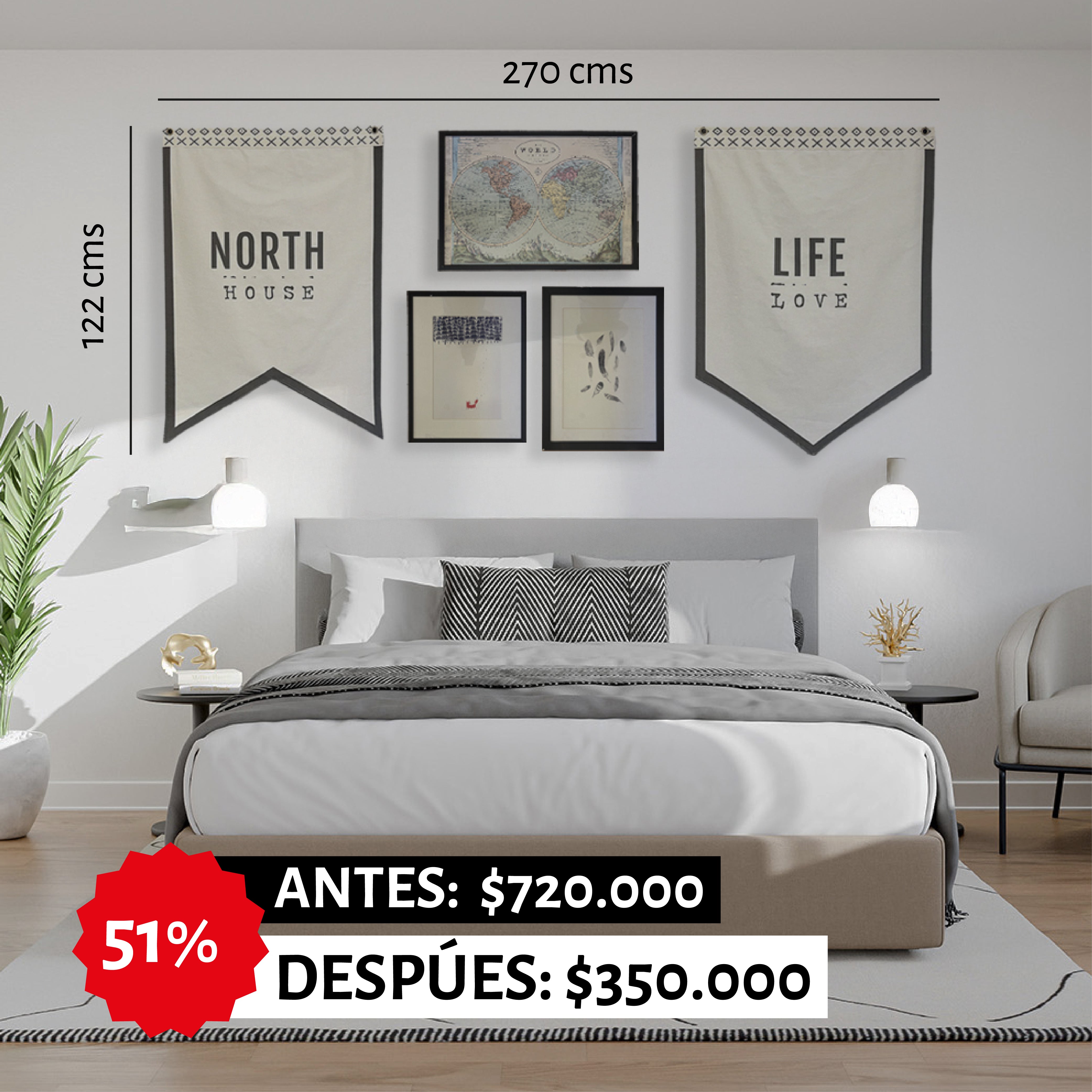 Esta composición es ideal para darle un look cálido y único a tu espacio por sus diferentes texturas y colores neutros. Ideal para poner en dormitorios, salas de estar o áreas comunes.