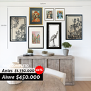 Esta composición es ideal para lograr personalidad y audacia. No pasa desapercibida. Si quieres un efecto WOW, este muro galería es para ti. Especial para living, salitas o comedor.