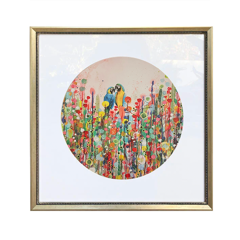 Cuadro de 75x75 cms. Reproducción técnica acuarela de la artista Sylvie Demers. Enmarcado con paspartú circular blanco y marco folia con pelotitas.