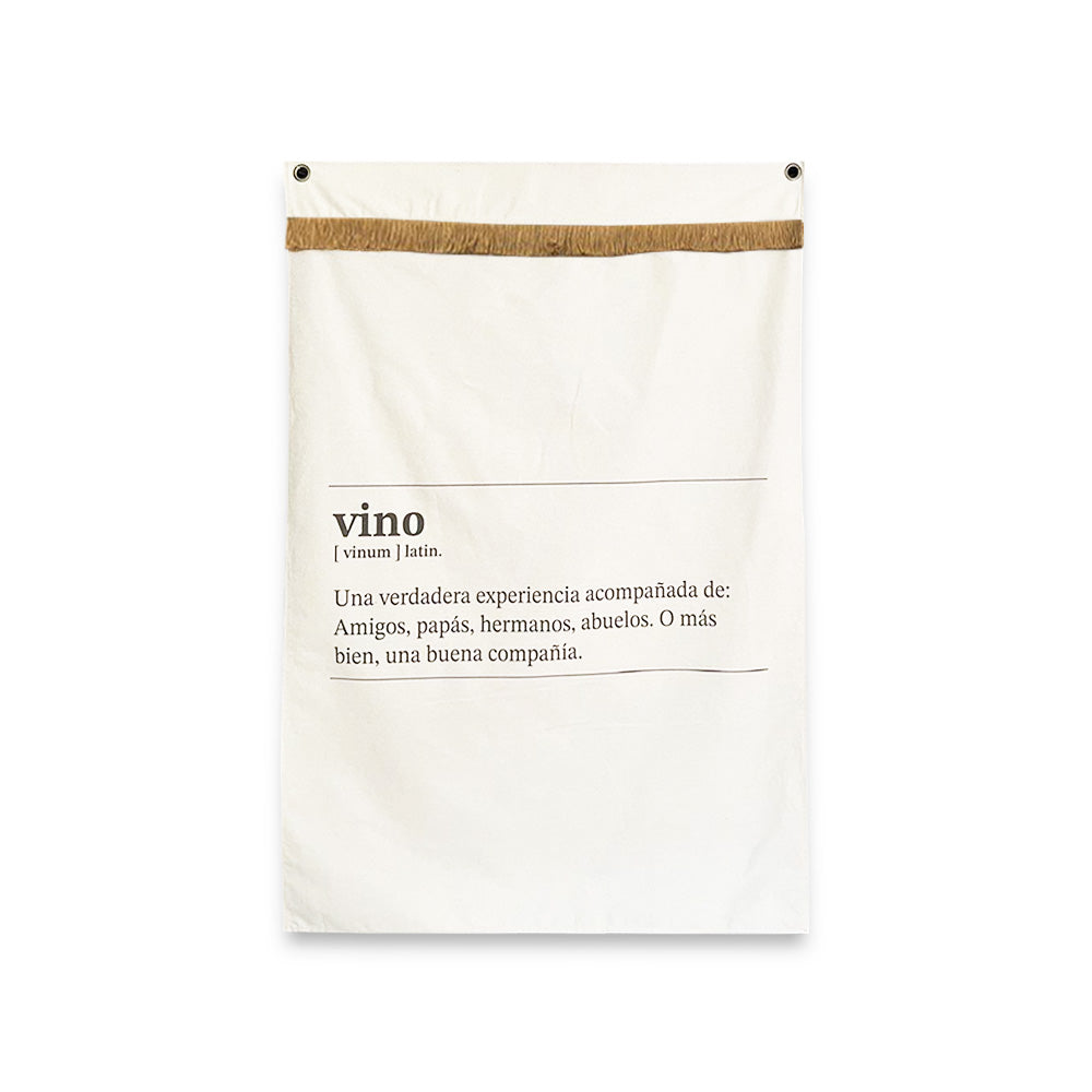 Wall de 120x85 cms. Lona gruesa color crudo impresa con ojetillos en las esquinas para colgar con huincha superior flecos de yute. No se enmarcan. Se cuelgan directamente en el muro directo de los Ojetillos.