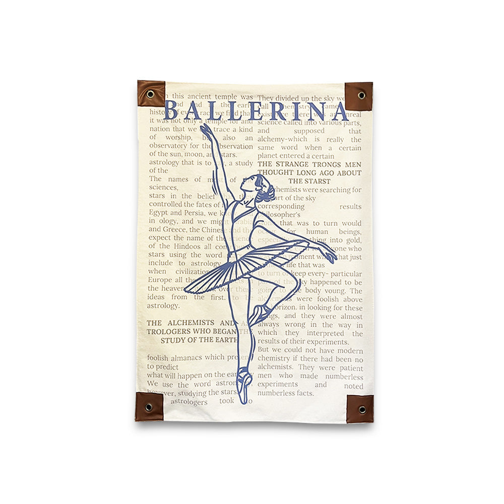Wall de 86x122 cms. Lona gruesa color crudo impresa, con ojetillos en las esquinas para colgar y esquineros de cuero. No se enmarcan. Se cuelgan directamente en el muro directo de los Ojetillos.